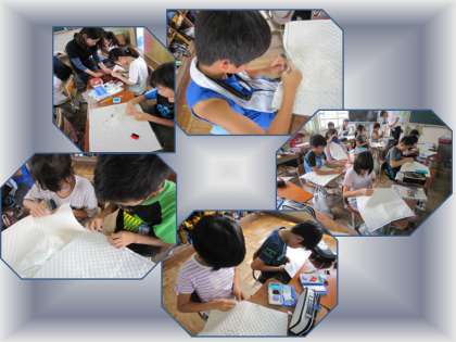 5年2組では,家庭科で学んだ半返し縫い・本返し縫いを使ってナップサック制作中です。