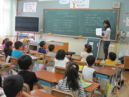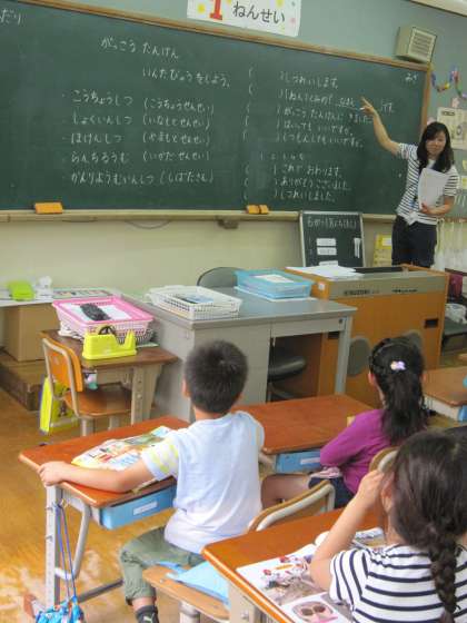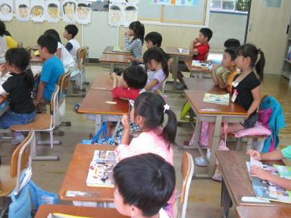 1年1組では,学校探検の時にそれぞれの部屋で行うインタビューの練習をしていました。