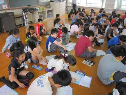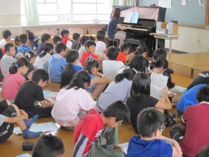 5年生は,音楽室に集まってキャンプファイヤーの時に歌う歌の練習をしていました。