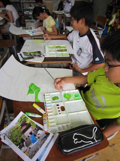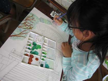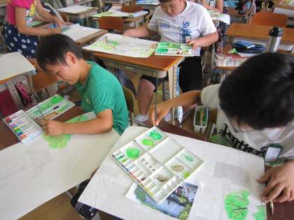 木の葉を少しずつ色を変えながら表したり点の集まりのような塗り方をしたりしていました。