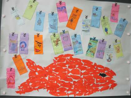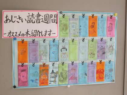 あじさい読書週間として,辞書引き大会をしたりおすすめの本の紹介しおりを作ったりしました。