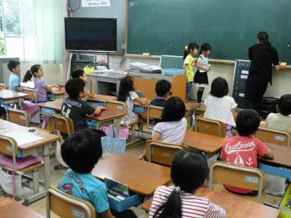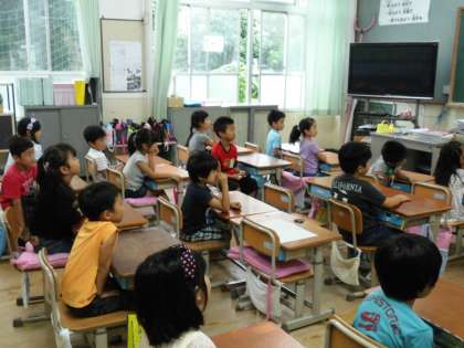 1年1組では,朝の会で天候による予定に変更が伝えられていました。