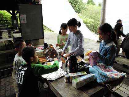 アルミホイルにくるんで牛乳パックにいれて火をつけます。