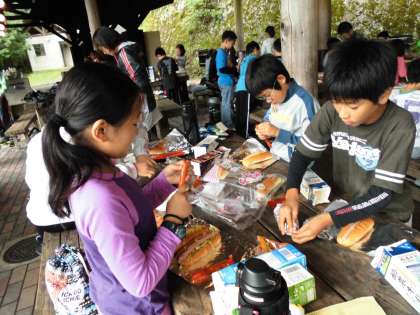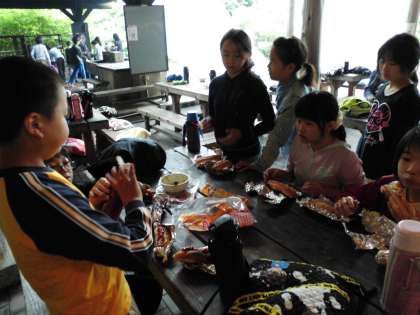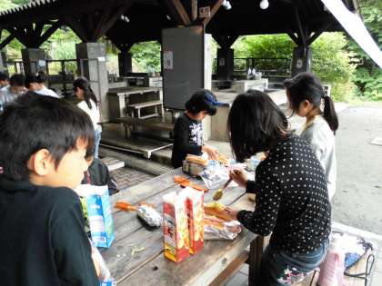 簡単ホットドックのできあがり。ただしちょっとこげてしまうのが欠点。でも子どもたちはおいしそうに食べていました。