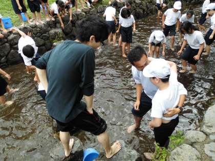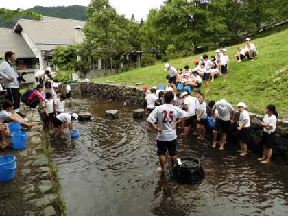 11時頃から山の家に渓流が流れている池と呼ばれるところで魚つかみをしました。
