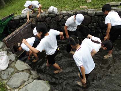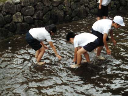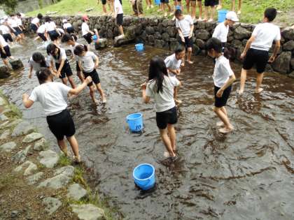 池に放流されたイワナは最初は元気でなかなか捕まえることができません。