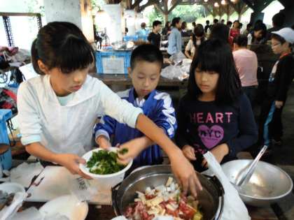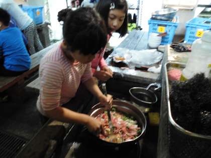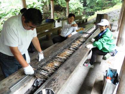 イワナを炭火でじっくり焼いている間に,豚汁の準備。昨日の反省を生かして今日はうまく作れるかな。