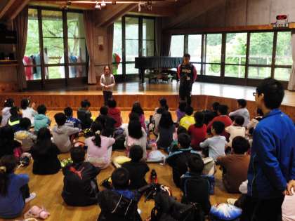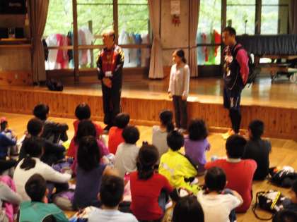 オリエンテーションホールで朝の集いをしました。今日のめあては「挑戦・協力」。主な活動内容は「山登り」と「キャンプファィヤー」です。