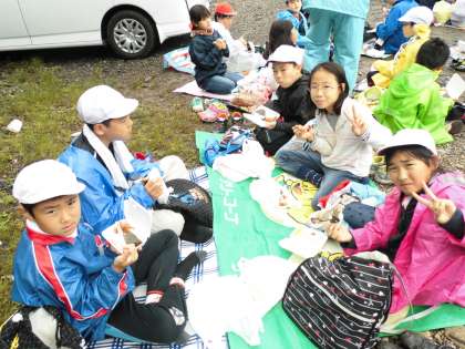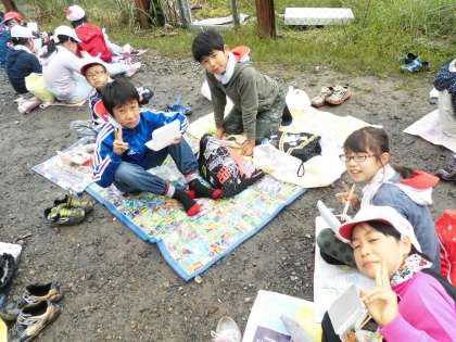 グループごとに集まって「おにぎり弁当」をいただきました。