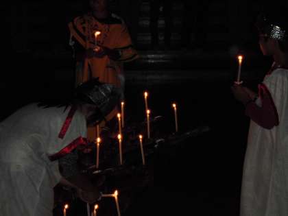 火の神が火の子たちに「知恵」「勇気」「優しさ」「友情」の火を分け与えました。そして火の子たちはキャンドルに火をともしました。