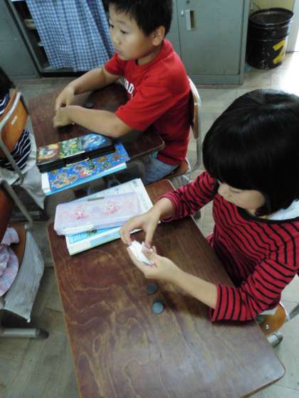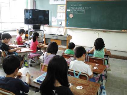 2年2組では,「10を24こあつめたかずはいくつですか」という課題を解決しようと,手作りの10円玉などを使って学習していました。