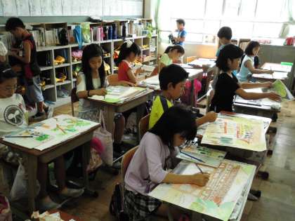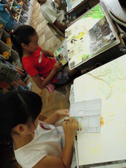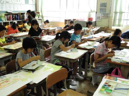 4年2組では,写生した絵に色を付けていました。