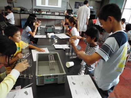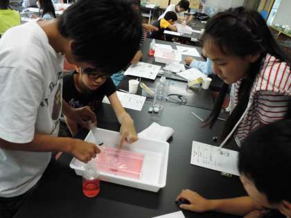 音がどのように伝わっていくのか,水を使って実験して,視覚的に動きをとらえることができるようにしました。