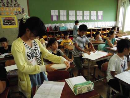 6年生では,夏休みの過ごし方の話といっしょに休み中の課題も配られていました。課題をするのに画用紙が必要な子には画用紙も配られていました。