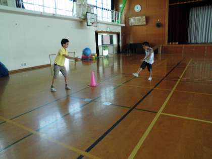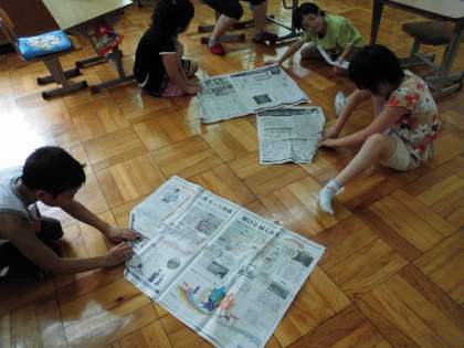 体育館でボール遊びをして疲れたので,休憩をかねて新聞紙で工作をしました。