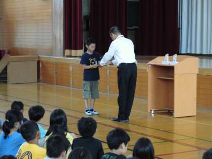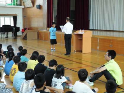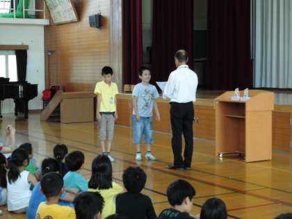 7月24日(金)夏休み前の最後の1日,5校時に全校終わりの会を実施しました。初めに3泊4日の長期宿泊学習を協力してやり終えた5年生に対して,学校賞団体賞が贈られました。