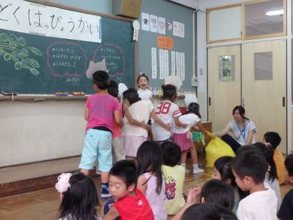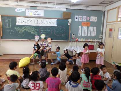 おじいさん役,おばあさん役,まご役だけではなく,いぬ役,ねこ役,ねずみ役の子もそれぞれ,小さくなったり,鳴き声を出したりと工夫をして,発表ができていました。