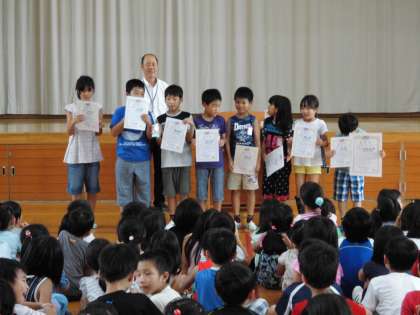 最後に先日行われた綱引き大会で,低学年の部3位に入賞した「あらひがジャイアンツ」と高学年の部3位に入賞した「ARAHIGA RED」の表彰が行われました。