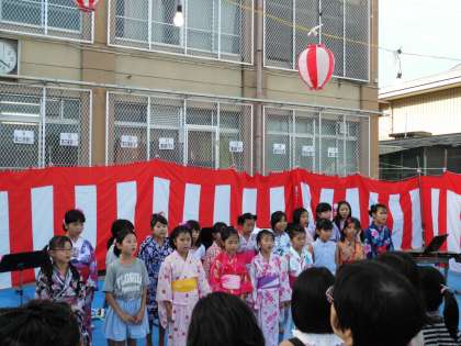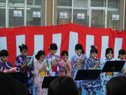 ステージ発表の最初は,音楽教室の発表です。「小さな世界」「キセキ」の合奏と「にじいろ」の合唱をしました。浴衣を着た子ども達が多く,夏祭りの雰囲気が感じられました。