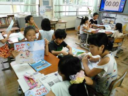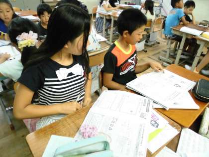 4年2組では,夏休みのプリント課題の見直しをしていました。また,休み前に学習した「エコライフ」についてのふりかえりもしていました。