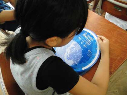 この学習では,星座早見盤を使います。「昨日の月は,この形やな。」と星座早見盤を見ながら話している子もいました。