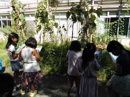 大きく成長したヒマワリを見たある子は,「シャワーみたいになっている。」と言っていました。