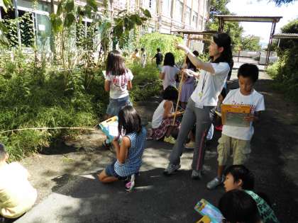3年1組では,花壇で育てているヒマワリの観察をしていました。