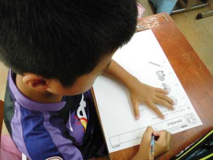 1年1組では,絵にあうことを選んだり名前を書いたり,ミカンや車などの数え方を答える問題に取り組んでいました。