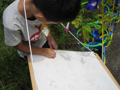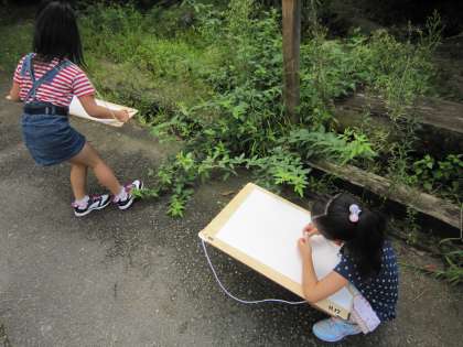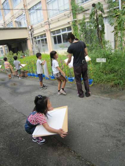 この「かげをうつして」では,葉っぱなどのかげを画用紙に写しとります。