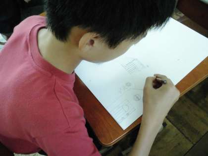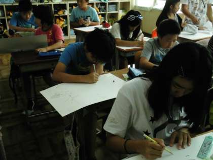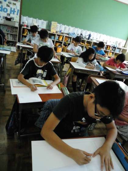 子どもたちは,下絵の参考になる本の挿絵を見ながら描いていました。