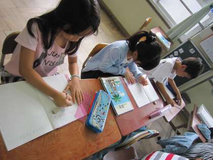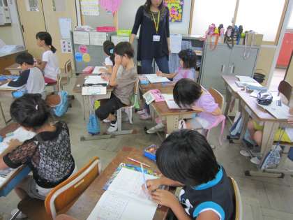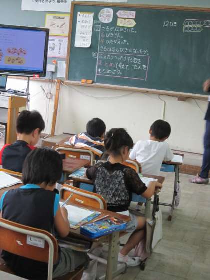 2年生は,算数で「増えたり減ったりする数をまとめて考えよう」という学習をしています。2組では,問題を解きながら,まとめて考えるというめあてを達成しようとしていました。