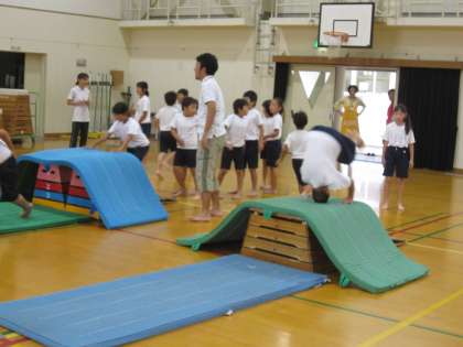 3年生の「とびばこ」では,開脚とびやかかえこみとび,台上前転の練習をしていました。