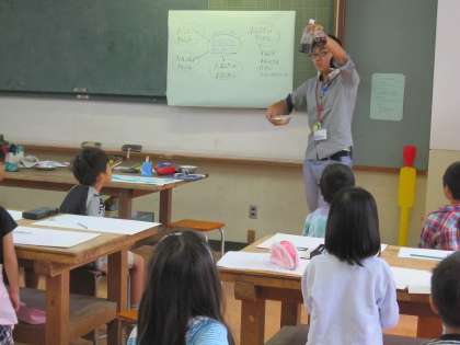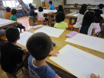 1年2組では,お話の絵を描くために,「えらんだ場面・登場人物〈動物〉・どんな景色なのか」をメモしようとしていました。