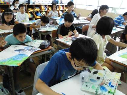 6年1組では,子ども達が描いている場面に合う色を考えながら塗っていました。
