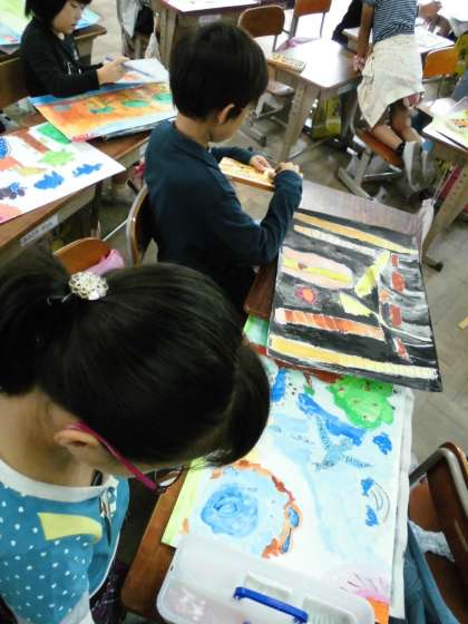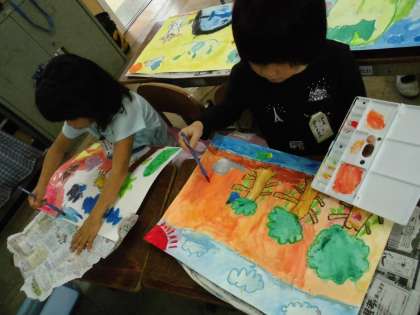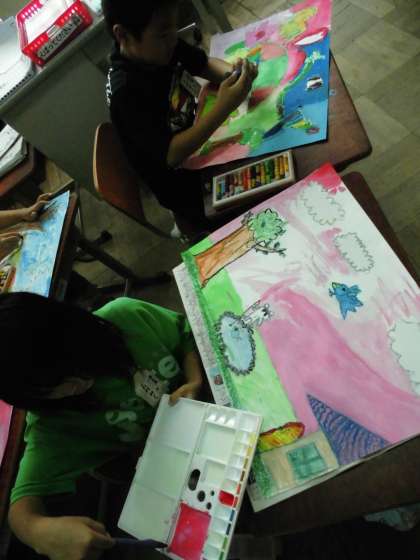 2年2組では,お話の絵を仕上げ,そのあと互いに作品を鑑賞しあいました。