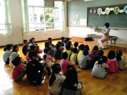 中間休みには,北きらめきルームに1年生や3年生がお話を聞きに来ていました。