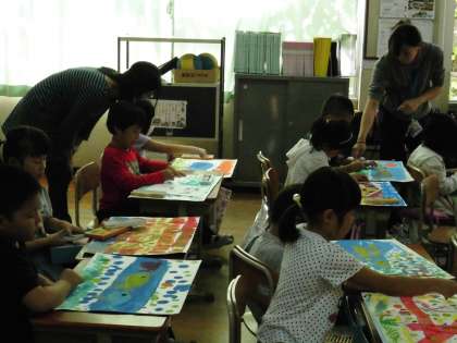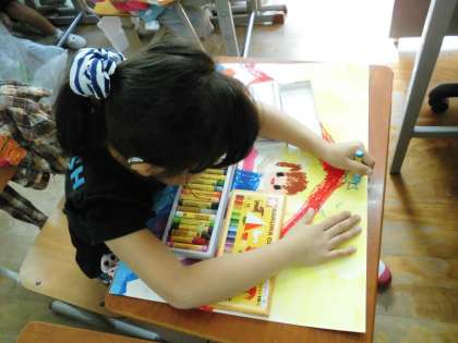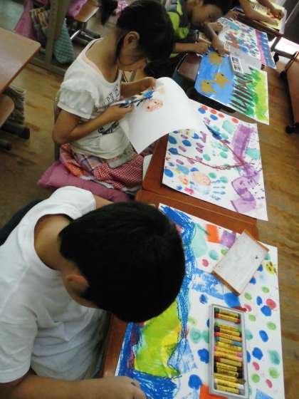 1年1組では,絵の描いた人を切り抜いて貼ろうとしたり,クレパスで色を塗ったりしていました。