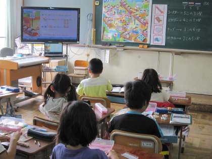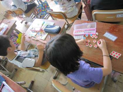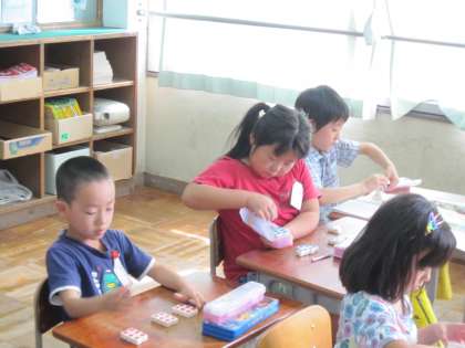 2年1組では,算数で「5こが3つあるとき,いくつになりますか」というかけ算の問題について考えていました。