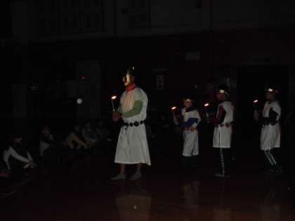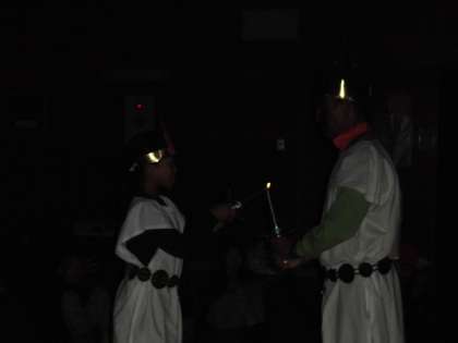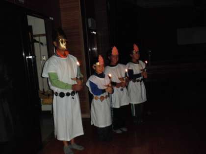 本日最後の活動「キャンプファイヤー」をプレイホールで行いました。最初に火の神と火の子が登場し,トーチで点火の儀式を行いました。