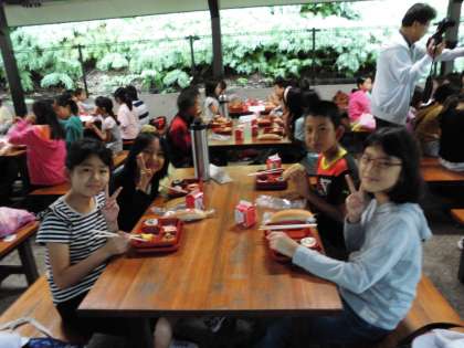 帰り支度をして,朝食を野外炊事場で食べました。大きなけがや病気になる児童もなくみんな元気に過ごしています。この後退所式をして,志摩水族館「マリンランド」に向かいます。