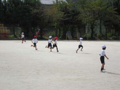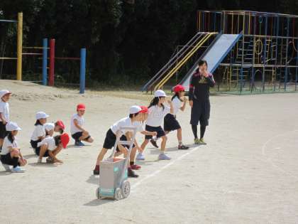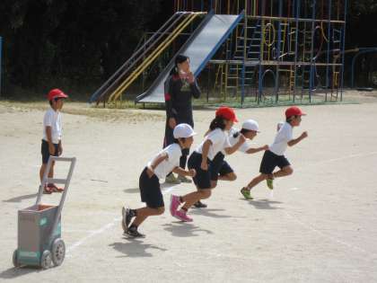 「よぉい,ドン」でスタートします。そのあとはまっすぐに走ります。まっすぐに走る機械は少ないので,蛇行してしまう子もいます。運動会当日に向けて,練習を重ねていきます。