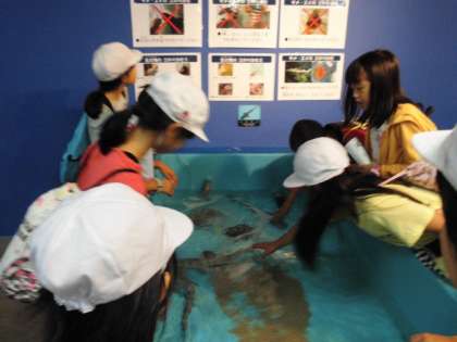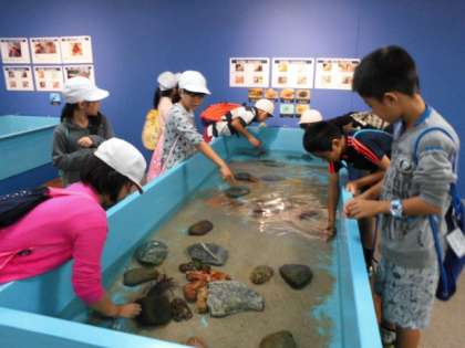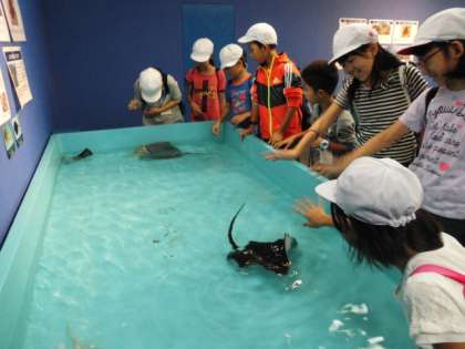 新しい試みとして,サメやエイ,イセエビやゾウリエビなどいろいろな海の生き物にさわることのできる体験コーナーがあって,子ども達も大興奮。ぬるっとした肌触りの生き物や硬いからの甲羅をまとった生き物など,いろいろな触感を味わうことができました。