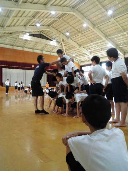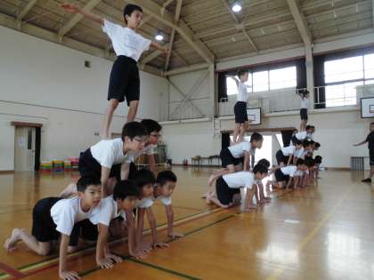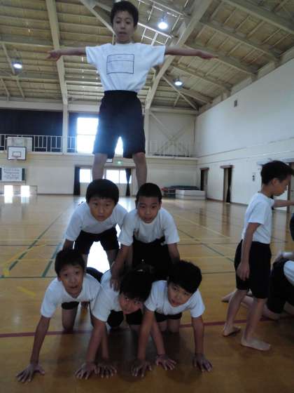 組体操は3段と4段のピラミッドに挑戦しました。特に4段は,体重を支えるのが大変で,何度も人を変えて作りました。