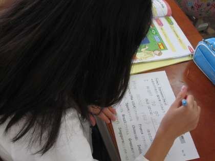 2週間に一度,中学校の英語の先生が6年生と一緒に学習しています。
