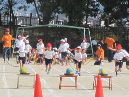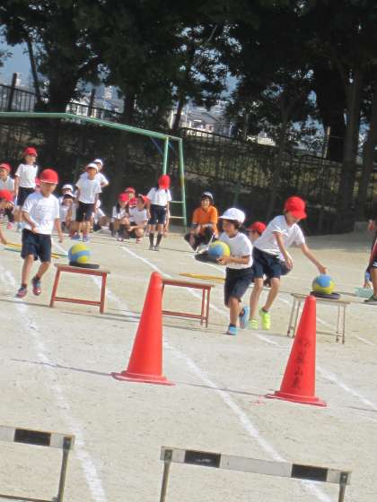 フラフープをくぐり,ドッジビーにのせたボールを運び,最後はハードルをジャンプします。どの子も速く前に行こうと頑張っていました。