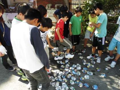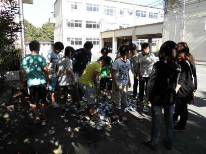 担当の子ども達とPTAの方々とでアルミ缶をふんで小さくしました。こうして集められたアルミ缶はリサイクルに回っていきます。