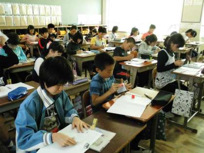 5年1組では,「どんな三角形でも面積の求められる方法を考えよう」という課題で学習していました。自分で考えて得たものは,忘れにくいものです。しっかりと考えて自分のものとしてほしいと思います。