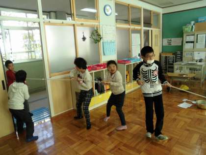 あおぞら学級は,「大きなかぶ」を教室でしました。長縄を引っ張って「うんとこしょ,どっこいしょ」。