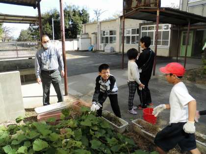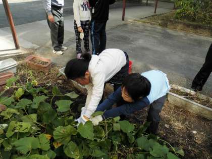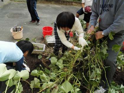 芋のつるを引っ張ってみると,大きな芋がたくさん出てきてびっくりしました。