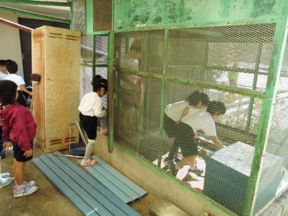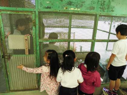 順番に2〜3人ずつうさぎ小屋に入っていくのですが,待ちきれずに網越しにうさぎたちを見ている子たちもいました。